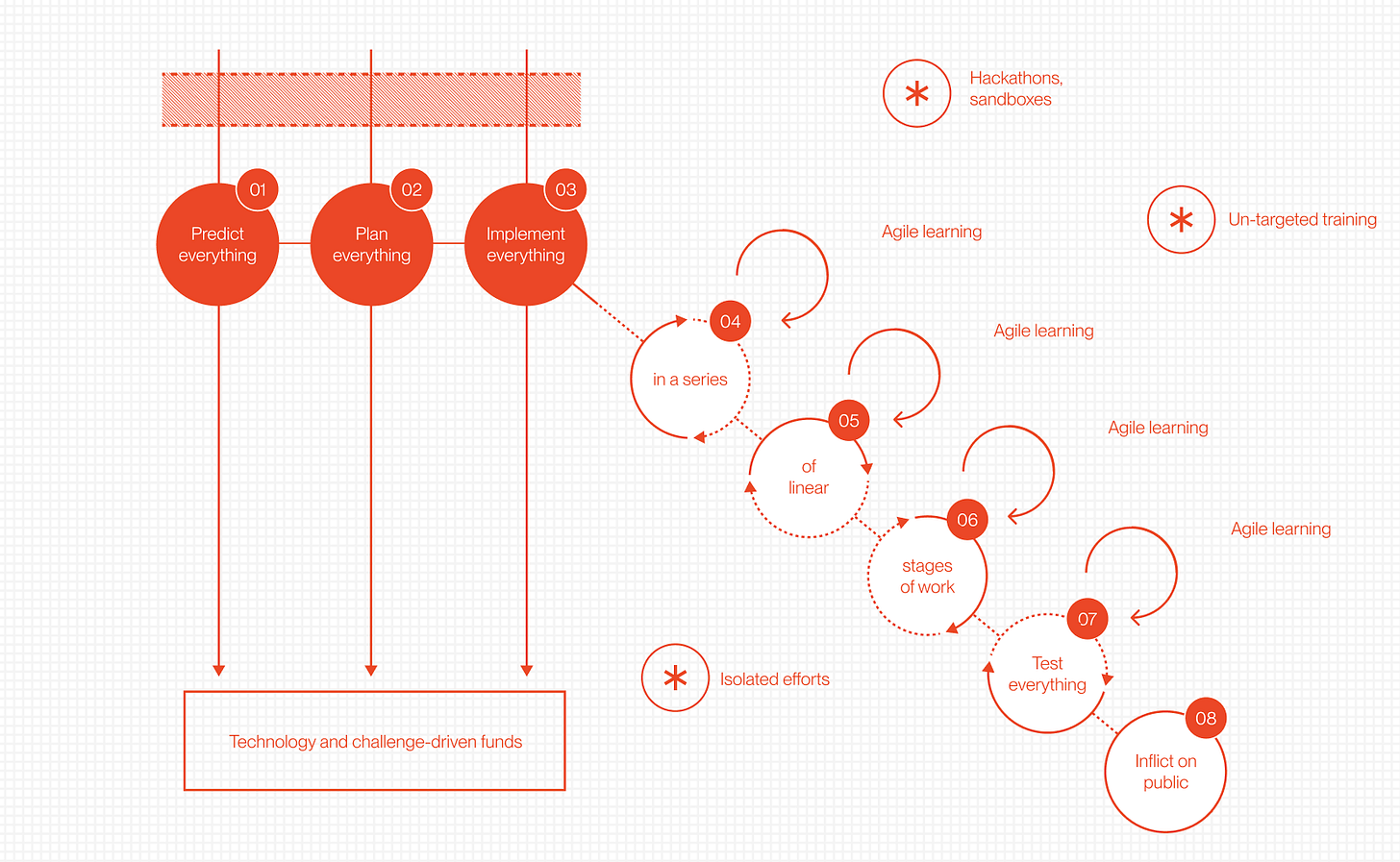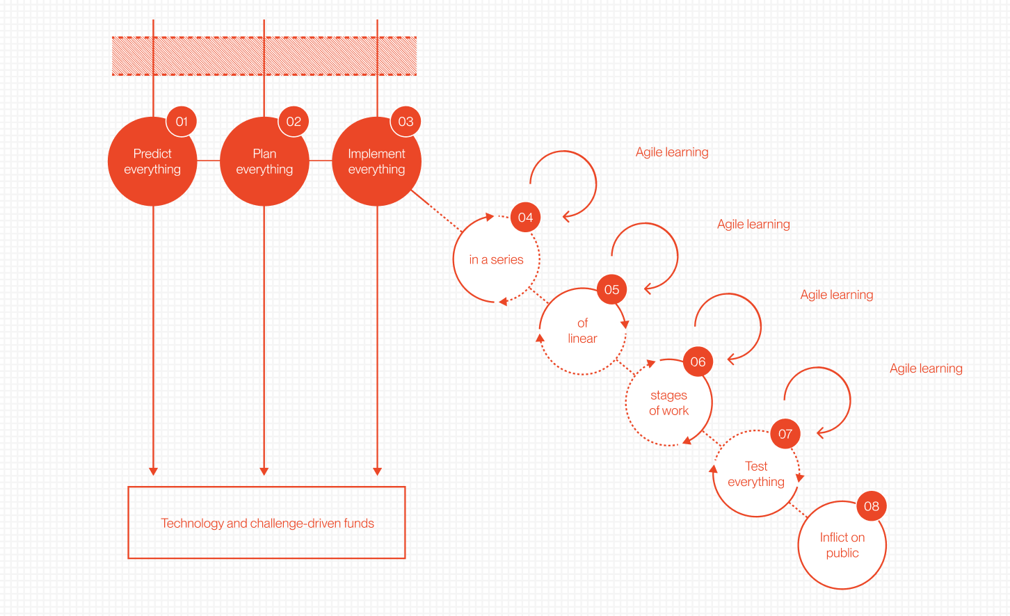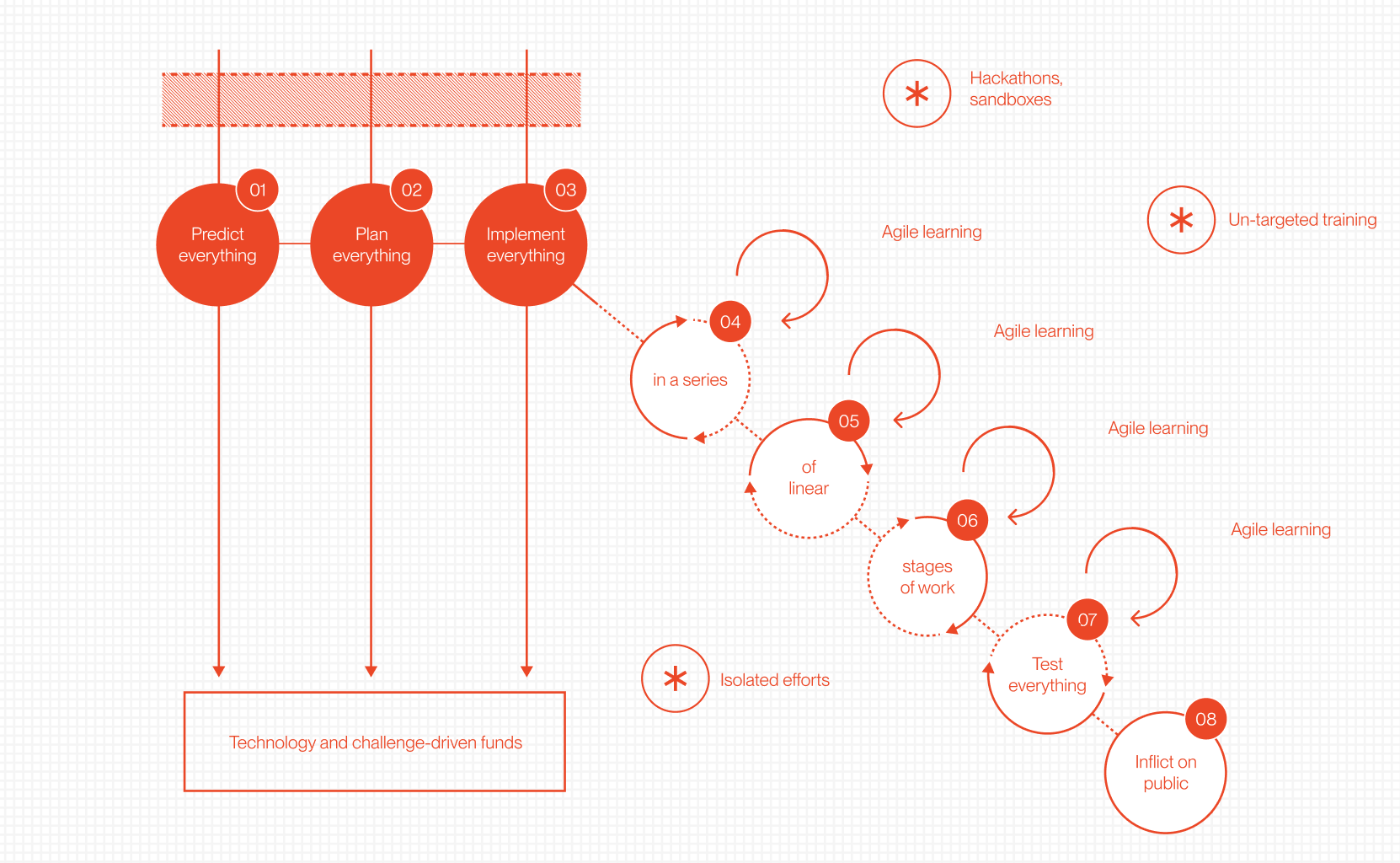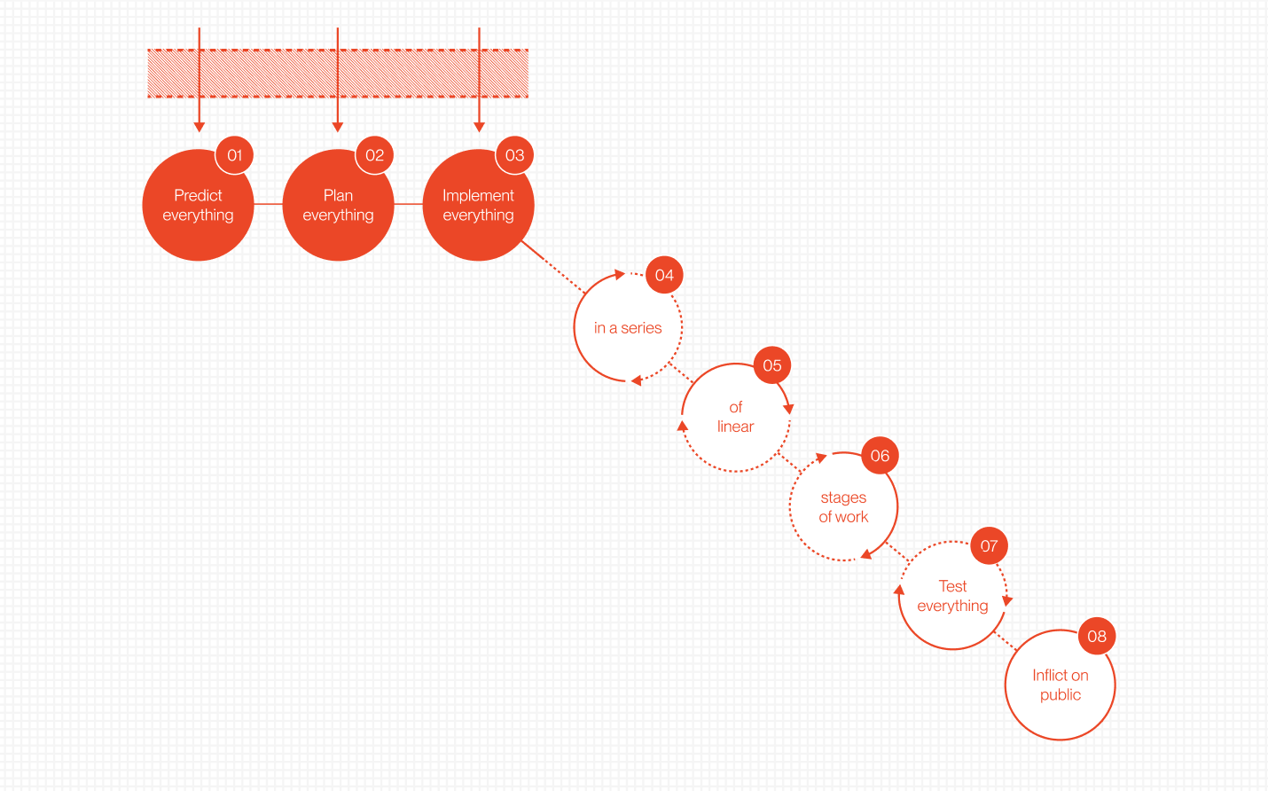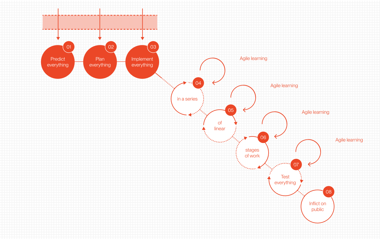Public Digital’s The Radical How illustrates this issue. In the dominant waterfall model of policymaking, the most consequential decisions are made upfront – precisely when uncertainty is highest – while learning arrives later, once direction has already been fixed. The process follows a familiar pattern: Write policy → guess requirements → procure IT systems → Inflict on users at scale → operate indefinitely.
