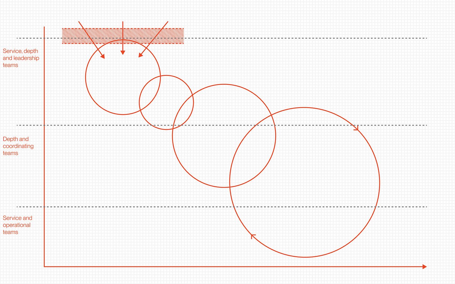 Crucially, these teams do not all operate in the same way, nor at the same time. Early in the lifecycle of a mission – when uncertainty is highest – depth, enabling, and coordinating teams play a larger role in sense-making and connecting. As direction stabilises and uncertainty reduces, service and operational teams take on greater responsibility for shaping and delivery.