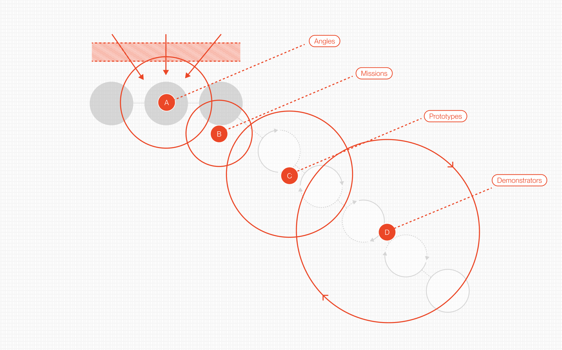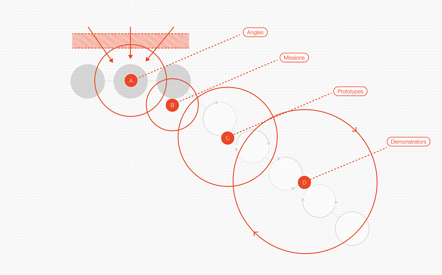 The flow follows Vinnova’s mission-design framework, moving from Angles → Missions → Prototypes → Demonstrators, progressively reducing uncertainty while keeping direction open for as long as possible.